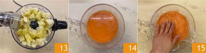 Ajusta de sal y pimienta 13, luego bate hasta obtener una salsa fluida 14. Transfiérela a un bol y cúbrela con film transparente de manera que toque directamente la salsa 15. Colócala en el refrigerador y déjala reposar durante 2 horas.