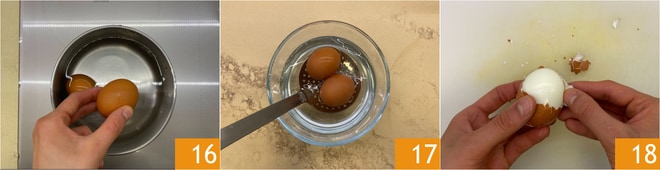 Pon dos huevos en un cazo con agua fría 16, lleva a ebullición y cocina durante 7 minutos. Enfría los huevos en agua fría 17, luego quita la cáscara 18.
