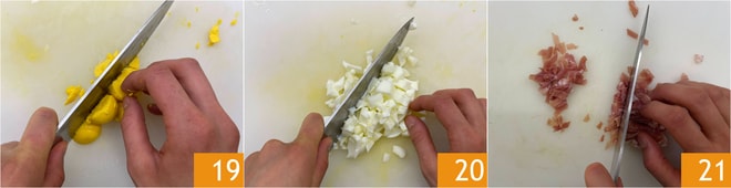 Córtalos a la mitad y separa las yemas de las claras, luego pícalos en trozos grandes 19 20. Corta el jamón serrano primero en tiras y luego en cubitos 21.