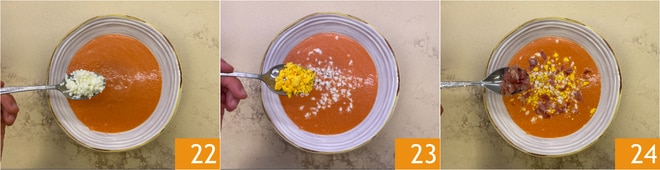 Sirve la sopa y añade las claras 22, las yemas 23 y el jamón serrano 24.