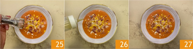 Completa con pimienta 25 y un hilo de aceite 26. Tu salmorejo está listo para ser servido 27.