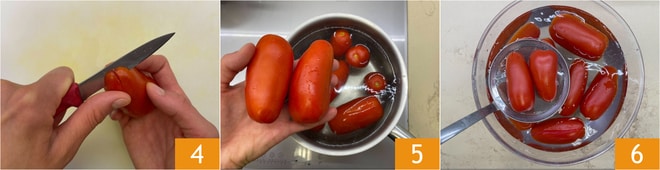 Mientras tanto, haz una cruz en la parte del tomate sin pedúnculo 4, escáldalos durante 1 minuto 5 y enfríalos en agua fría 6.
