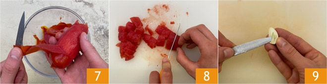 Elimina la piel de los tomates 7 y córtalos en cubitos 8. Pela el ajo y quita el germen 9.