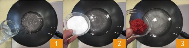 Para realizar la salsa agridulce, lo primero que debes hacer es verter el agua en un wok o cacerola 1 y llevar a ebullición; luego, añade el azúcar 2 y el concentrado de tomate 3.