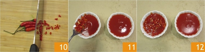 Para una variante picante, pica finamente guindilla roja 10 y añádela directamente a la salsa 11. ¡Disfruta de la salsa agridulce con tus platos chinos favoritos 12!