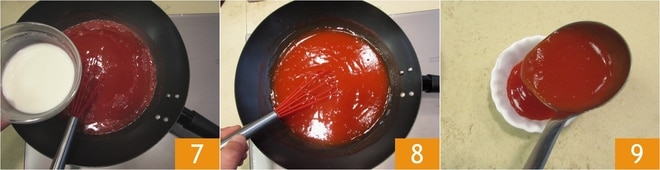 Añade también el vinagre y mezcla bien con un batidor mientras lo llevas nuevamente a ebullición 4. Mientras tanto, coloca la fécula en un tazón aparte, añade 4 cucharadas de agua 5 y mezcla el compuesto con una cuchara 6.