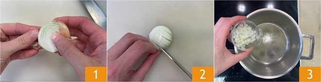 Para preparar la salsa de curry, lo primero que tienes que hacer es pelar 1 y picar finamente la cebolla 2, luego colócala en una cacerola 3.