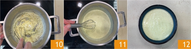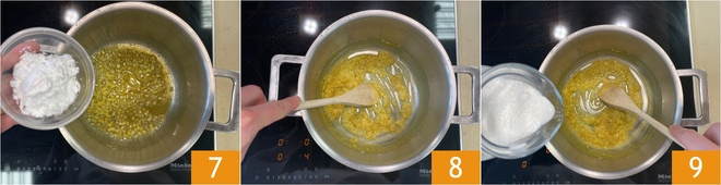 En este punto añade la fécula 7. Mezcla con una cuchara de madera 8, luego vierte lentamente la leche de coco, continuando a mezclar 9.