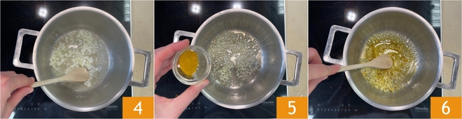 Añade la mantequilla y sofríe a fuego lento 4, luego agrega también el curry 5. Tuesta la especia mezclando bien 6.