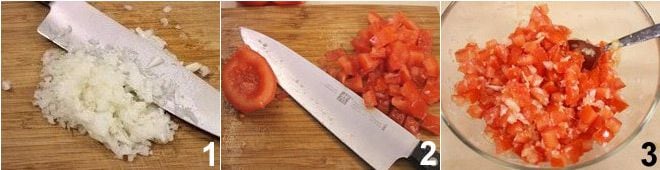 Para preparar la salsa de tomates mexicana comienza limpiando y picando finamente la cebolla blanca 1, luego colócala en un bol grande junto con el jugo y la ralladura de lima; lava y corta en cubitos los tomates 2 y añádelos al bol junto con la cebolla 3.