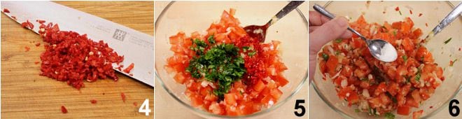 Lava, seca y pica el cilantro, lava las guindillas, quítales las semillas internas y córtalas finamente 4, luego añade estos ingredientes al bol 5 junto con el azúcar 6; mezcla suavemente para disolver el azúcar, luego añade la sal, mezcla, cubre con film transparente y deja reposar durante al menos 3 horas en el frigorífico antes de servir.