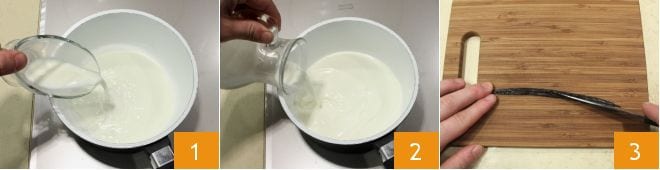 Para preparar la salsa de vainilla, verted en un cazo la nata 1 y la leche 2; cortad la vaina de vainilla a lo largo 3,