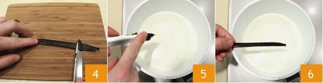 extraed las semillas internas con un cuchillito 4 y añadidlas a la nata y leche 5; luego verted en el cazo también la vaina de vainilla 6 y llevad a ebullición a fuego lento; después apagad y dejad infusionar durante unos 30 minutos.