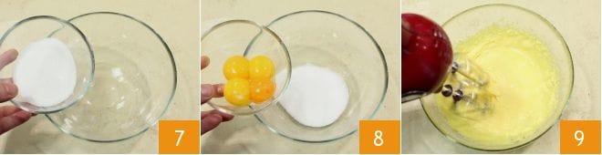 Mientras tanto, verted el azúcar en un bol 7 y agregad las yemas 8 y batidlas con las varillas eléctricas 9 o con la batidora, hasta obtener una mezcla clara y espumosa.
