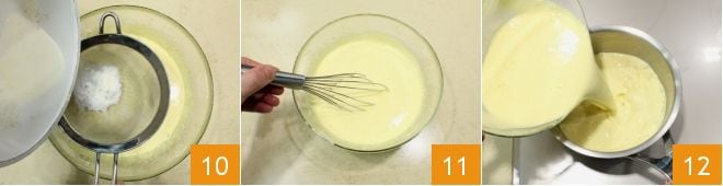 En este punto, después de los 30 minutos de infusión, unid la parte líquida a las yemas montadas filtrándola a través de un colador 10; mezclad suavemente con una varilla 11 y volved a poner la crema en el cazo 12 a fuego muy bajo.