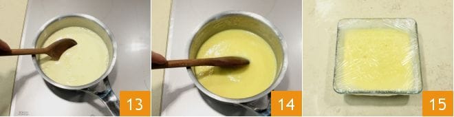 Mezclad 13 y dejad que la crema espese, pero sin llevarla nunca a ebullición 6; si tenéis un termómetro, aseguraos de no superar los 83°C. Una vez lista 14, si no usáis la crema de inmediato, podéis conservarla cubierta con film adherente a la crema misma 15 para que no se forme una capa en la superficie. De lo contrario, utilizadla para acompañar los postres que más os gusten.