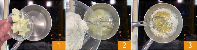 Para preparar la salsa gravy, lo primero que hay que hacer es preparar el Caldo de carne con nuestra receta. Una vez listo el caldo, pon la mantequilla en un cazo pequeño y deja que se derrita suavemente a fuego bajo 1, para obtener una base lisa y uniforme. Cuando la mantequilla esté completamente derretida, añade la harina 2 y mezcla inmediatamente con la batidora de mano para crear el roux 3.