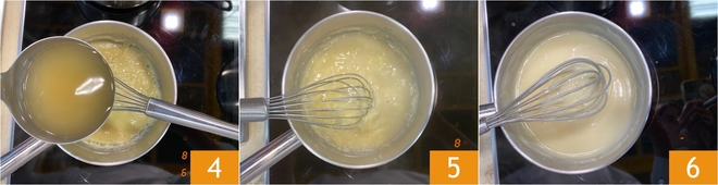 Continúa trabajándolo al fuego, siempre mezclando, hasta que empiece a oscurecerse ligeramente y adquiera un bonito color avellana. En este punto, incorpora el caldo de carne caliente poco a poco 4, vertiéndolo en hilo mientras sigues mezclando enérgicamente para evitar la formación de grumos 5. Verás que, a medida que añades el caldo, la salsa comenzará a espesarse como una bechamel, volviéndose suave y brillante. Continúa la cocción hasta obtener una crema aterciopelada y uniforme 6.