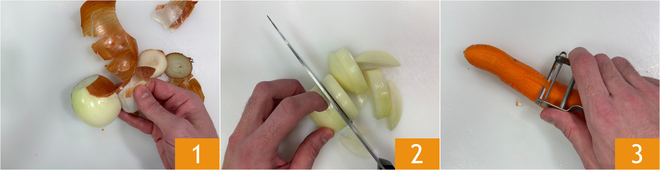 Para preparar la salsa para asado, como primer paso prepara el Caldo de carne y mantenlo caliente. Pela las cebollas 1 y córtalas en gajos 2. Pela las zanahorias 3.