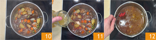 Deja que se evapore completamente 10, luego añade el caldo de carne 11 y el concentrado de tomate 12.