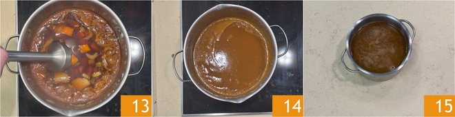 Cocina a fuego bajo durante una hora. Una vez listo, tritura todo con una batidora de mano 13 hasta obtener una mezcla sedosa y cremosa; deja espesar durante 10 minutos más a fuego bajo removiendo de vez en cuando 14. ¡Tu salsa para asado está lista para ser servida 15!