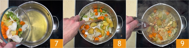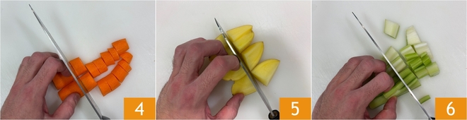 Corta las zanahorias en trozos 4 y haz lo mismo con las patatas 5 y el apio 6.
