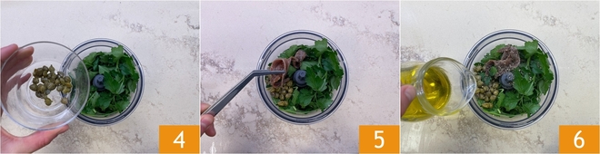 Añade las alcaparras desaladas 4, las anchoas en aceite 5 y el aceite 6.
