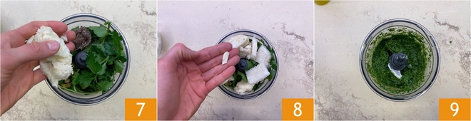 Finalmente, añade el pan escurrido 7 y el diente de ajo 8 y tritura durante unos segundos 9.