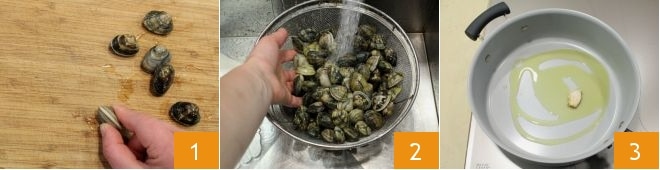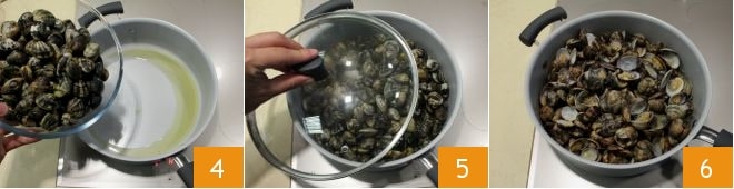 Luego quita el ajo y sumerge las almejas bien escurridas en la cacerola 4, mezcla y cubre con la tapa 5; cocina el tiempo necesario para que se abran las valvas, a fuego vivo. Una vez listas 6