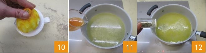 Exprime el zumo de la naranja 10, cuélalo y añádelo al líquido de cocción de las almejas 11. Enciende el fuego bajo, sazona con la pimienta molida 12