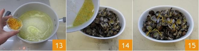 y luego la cáscara de naranja 13; reduce el líquido al menos a ¾, tardará unos pocos minutos. Vierte el condimento sobre las almejas aún calientes 14 y aromatiza el salteado de almejas a la naranja con unas hojitas de tomillo fresco 15.