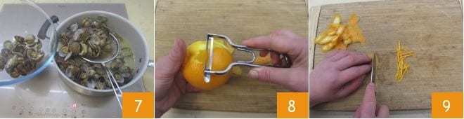 podrás escurrirlas con una espumadera 7 conservando en la cacerola el líquido que se habrá creado; mantén las almejas al calor y continúa pelando la naranja con un pelador de verduras para obtener solo la cáscara exterior 8 sin llevarte también la parte blanca más amarga. Luego corta la cáscara en juliana 9 y resérvala.