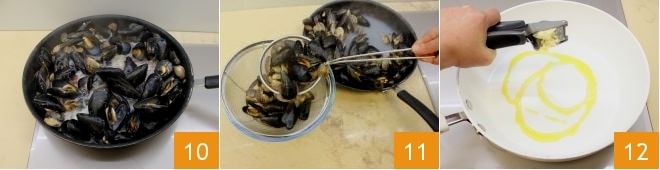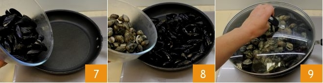 Después de haber limpiado cuidadosamente los moluscos, ábralos colocando en una olla los mejillones 7 y luego las almejas 8. Cubra con una tapa y cocine a fuego vivo para abrir las valvas 9.