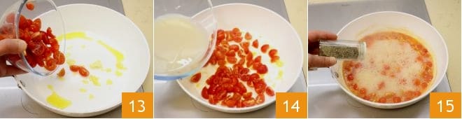 Sofría brevemente y agregue los tomates cortados previamente 13, déjelos dorar 1-2 minutos a fuego lento y luego vierta el líquido de cocción de los moluscos que ha reservado 14. Durante la cocción, sazone al gusto con pimienta molida 15.