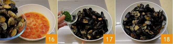 Por último, agregue los mejillones y las almejas y déjelos saborear brevemente con la salsa 16. Finalmente, agregue el perejil picado 17. Apague el fuego 18 y sirva el salteado de mejillones y almejas bien caliente, acompañado eventualmente de rebanadas de pan tostado.