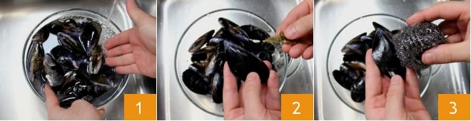 Para preparar el salteado de mejillones y almejas comience primero con la limpieza de los moluscos. Para limpiar los mejillones, coloque los mariscos en un recipiente grande, luego enjuáguelos bien bajo agua fría corriente 1. Con un movimiento enérgico, arranque manualmente la barba, o biso, que sobresale de las valvas 2 (para facilitar la operación es posible agarrar el biso con un paño de cocina). Siempre bajo el agua, frote enérgicamente los mejillones usando un estropajo de acero (o un cepillo rígido) para eliminar cualquier impureza 3.