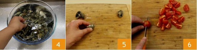 Para limpiar las almejas, lávelas bajo agua corriente 4 y verifique, golpeándolas una a una sobre una tabla de cortar, que no haya arena en su interior 5. Corte los tomates en gajos 6 y pique el manojo de perejil.