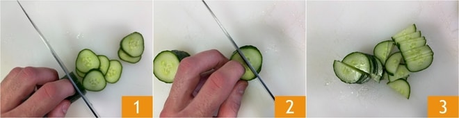 Para preparar el sándwich de pepinos y queso de cabra, comienza lavando los pepinos y cortándolos en rodajas muy finas 1. Luego, corta algunas de las rodajas por la mitad 2 y resérvalas 3.