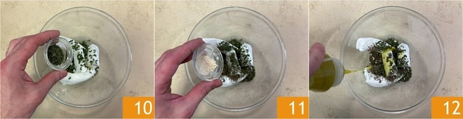Agrega las hierbas aromáticas secas (perejil, albahaca y cebollino) 10, el ajo en polvo 11, la sal, la pimienta y finalmente el aceite de oliva virgen extra 12.
