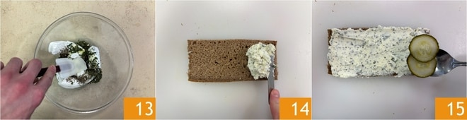 Mezcla todo con cuidado 13 y pasa a la composición del sándwich: unta generosamente una rebanada de pan con la crema de hierbas 14, luego distribuye los pepinos en rodajas 15.
