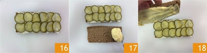 Colócalas una al lado de la otra para formar una capa ordenada 16 y luego unta otra rebanada con mayonesa 17. Superpónla a la otra con la parte untada de mayonesa hacia abajo 18.