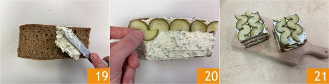 Y repite una capa completa, idéntica a la anterior: crema de queso, pepinos, rebanada de pan untada con mayonesa. En la superficie superior de la rebanada, unta nuevamente una fina capa de crema de queso 19 y decora con las medias rodajas de pepino, distribuyéndolas en filas ligeramente desfasadas para un bonito efecto visual 20. Corta tu sándwich por la mitad y decora al gusto con tomillo fresco 21.