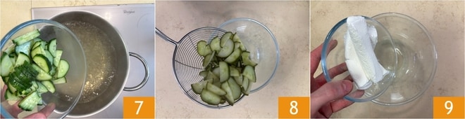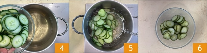Lleva a ebullición el agua con la sal y el vinagre e introduce las rodajas de pepino 4. Después de 1-2 minutos, escúrrelas 5 y resérvalas 6.