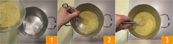 Para realizar el sándwich de polenta con verduras y taleggio, primero prepara la polenta: vierte la harina en forma de lluvia en agua hirviendo salada 1, luego cocina según las indicaciones del paquete (aproximadamente 5 minutos) mezclando continuamente con un batidor 2 hasta que espese 3.
