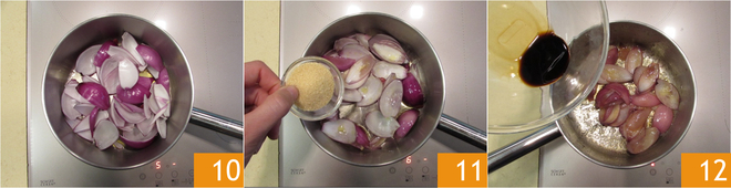 Añade las cebollas 10 y deja que se ablanden removiendo a menudo durante un par de minutos. Añade el azúcar 11 y un chorrito de agua y deja caramelizar durante 4-5 minutos removiendo de vez en cuando. Desglasa con el vinagre balsámico 12.