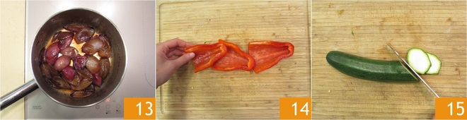 Desaparecido el olor a vinagre, las cebollas están listas 13. Limpia las verduras y corta el pimiento en tiras grandes 14 y el calabacín en rodajas oblicuas de 5 mm 15.