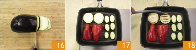 Corta la berenjena en rodajas de 7 mm 16. Asa todo en la parrilla caliente 17 hasta obtener unas bonitas estrías en ambos lados 18.