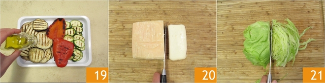 Condimenta las verduras con aceite y sal 19. Corta el taleggio DOP en rodajas gruesas de 8-9 mm 20. Corta la lechuga en tiras 21.