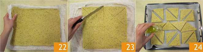 Recupera la polenta solidificada, recorta los bordes y luego corta la polenta en 4 grandes cuadrados de los cuales obtendrás, cortando en diagonal, 16 triangulitos 23. Colócalos en una bandeja, rocíalos con un poco de aceite y sal y hornea por 30 minutos en horno estático a 200° 24.