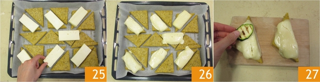 Saca del horno la polenta y cubre 8 rebanadas con el taleggio DOP cortado 25. Devuelve al horno estático a 200° por 2 minutos 26. Rellena los triángulos con las verduras a la parrilla 27 y las cebollas caramelizadas.